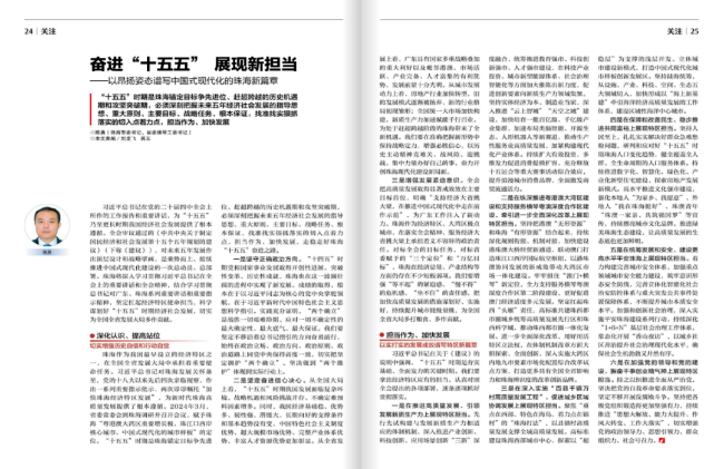 连日来,珠海市上下持续掀起学习贯彻党的二十届四中全会精神以及习近平总书记视察广东和出席第十五届全国运动会开幕式的重要讲话重要指示精神热潮。《南方》杂志近日刊发珠海市委书记、省委横琴工委书记陈勇文章《奋进“十五五” 展现新担当——以昂扬姿态谱写中国式现代化的珠海新篇章》。