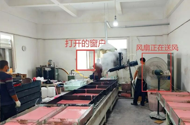 执法人员现场使用无人机高空巡查该企业配套的废气污染防治设施,发现设施疑似没有开启。执法人员兵分两路,一队到该企业楼顶检查废气污染防治设施,发现设施的传动带没有转动,随即固定证据;另一队到该企业二楼车间进行检查。检查发现车间内存在较重异味,其中搅拌车间窗户开启,风扇正对着搅拌机挤出口送风,废气经打开的窗户排至外环境;烘烤车间内2台烤箱正在运行,产生的VOCs废气在车间内无组织排放;搅拌、发泡成型、烘烤等工序配套的废气污染防治设施均未开启。