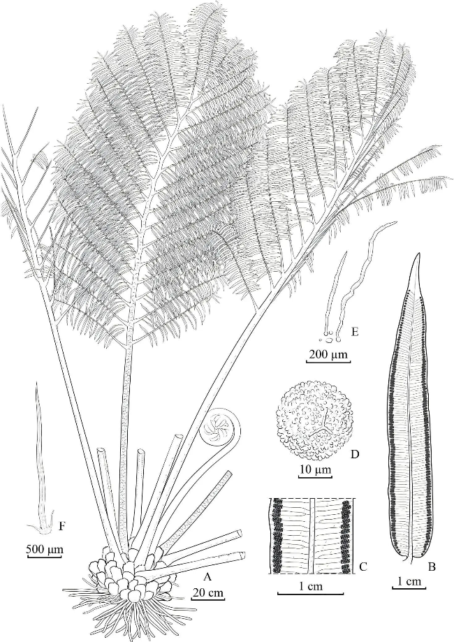 小羽片呈独特的线状披针形,背面也覆盖鳞片。
