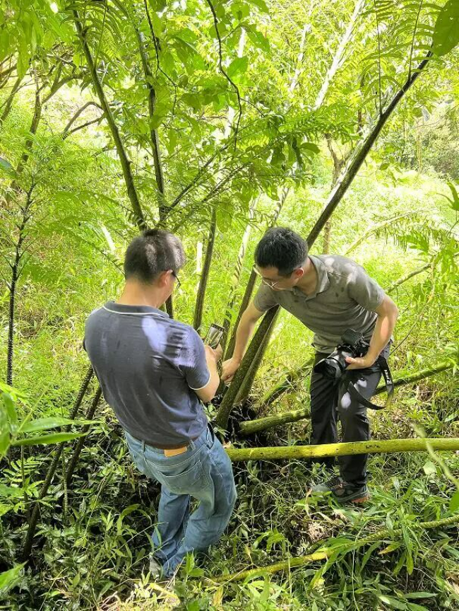 严岳鸿(左)带领团队深入保护区对广东观音座莲的生长情况和环境进行调研。
